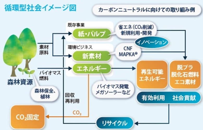 今後さらに永続的に発展していくため、2030年に目指す姿を「ビジョン2030」として、既存事業の発展・環境ビジネスの発展・イノベーションにより、森林資源の有効活用を通した循環型社会の構築と、持続可能な未来の実現を掲げています。