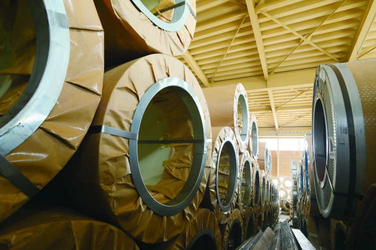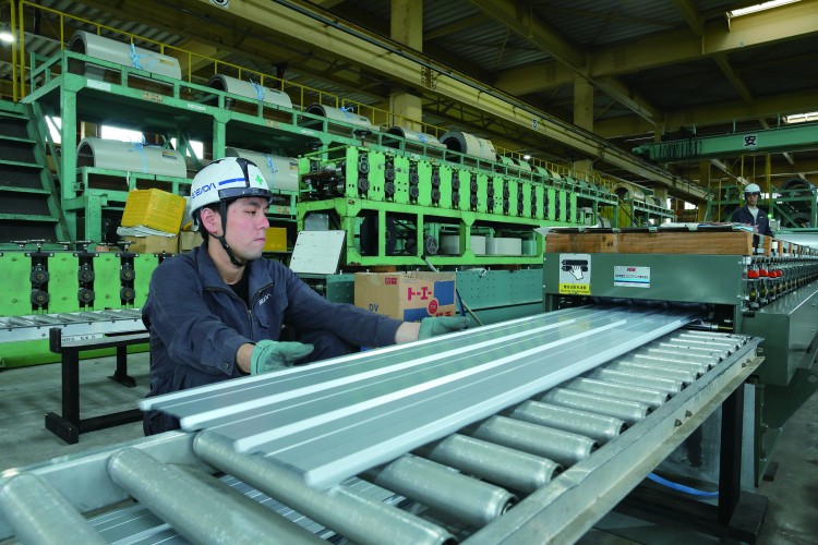 当社のモデルケースは、コイルメーカーから材料を仕入れ、工場内で成型加工を施し、屋根・外装建材を製造し、自社のトラックで配送を行い、施工業者あるいは建材商社に卸売りを行います。また、自社施工の工事では、工事現場で建材の製造を行いながら工事を行うこともあります。