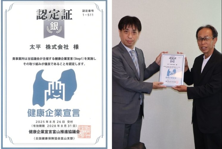 当社は健康経営優良企業を目指し、健康企業宣言富山推進協議会が認定する「とやま健康企業宣言」に取り組んでいました。この度、その活動が認められ「とやま健康企業宣言」銀(Step1)に認定されました。