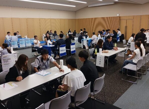イベントは県内大学4校(富山大学、富山国際大学、高岡法科大学、富山県立大学)と富山市内(富山国際会議場)で行われ、参加した学生は、年齢の近い若手社員との座談会形式・少人数での交流を通じて、働く人の生の声や県内企業の魅力に耳を傾けていました。