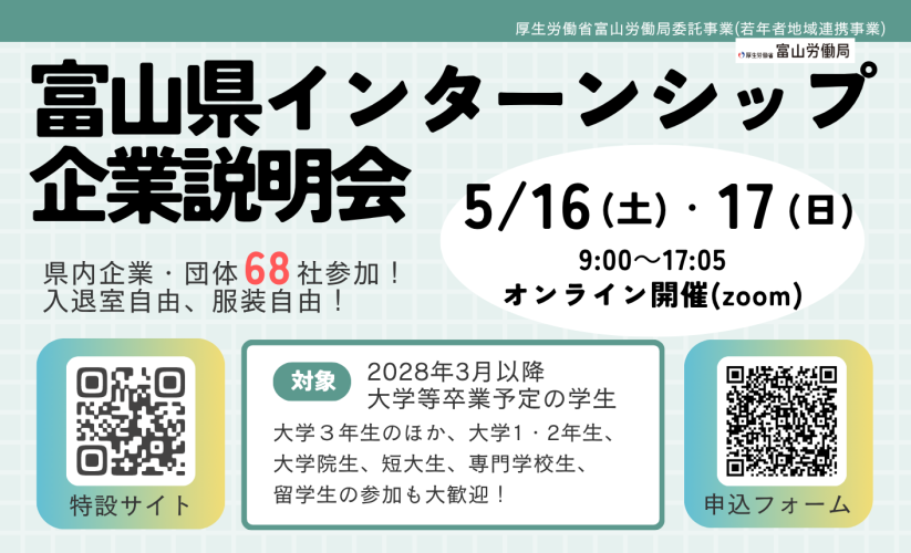 【2028卒の学生の皆さんへ】 5/16(土)・17(日) ✨富山県インターンシップ企業説明会✨ を開催します!
