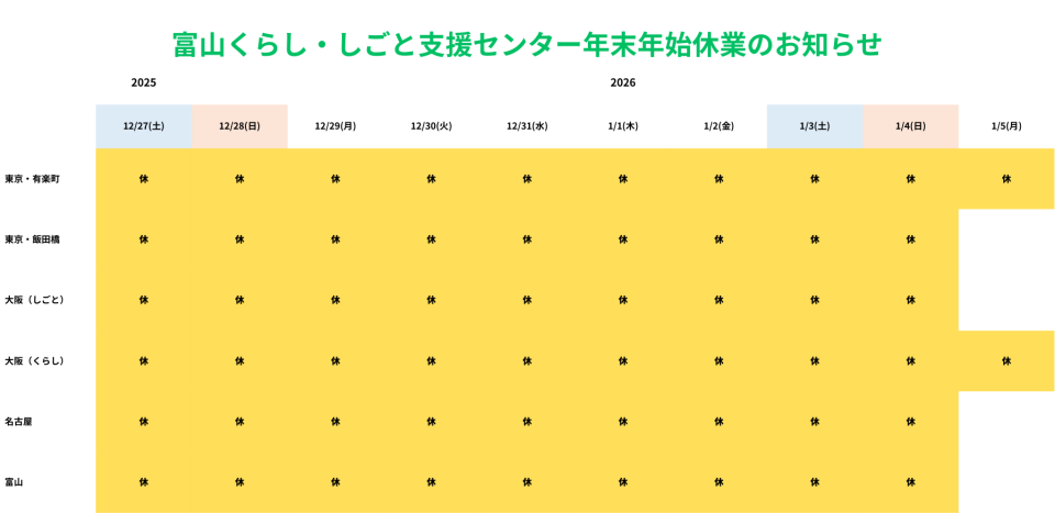 富山くらし・しごと支援センター 年末年始休業日のお知らせ